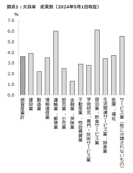 厚生労働省の「労働経済動向調査(令和6年5月)」を見ても、運輸業、郵便業を超えて欠員率が非常に高く、多くの店舗が慢性的な人員不足に直面していることが分かります。