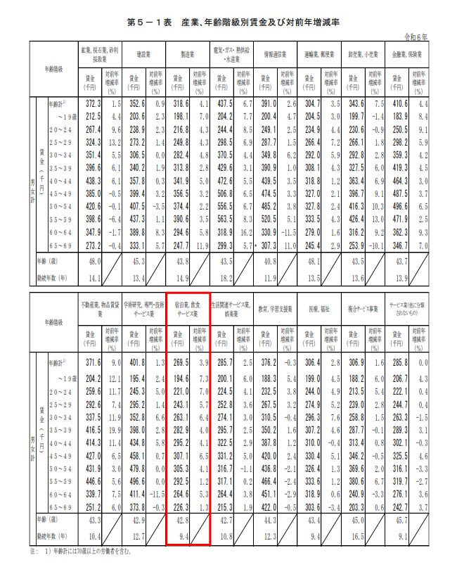 厚生労働省の「令和6年賃金構造基本統計調査」を確認しても、「宿泊業,飲食サービス業」が
